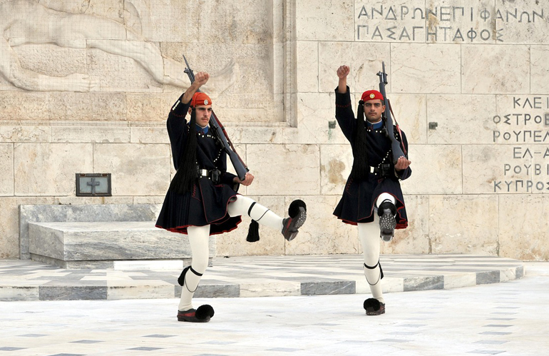 En af de mest ikoniske aktiviteter i Athen er at overvære vagtskiftet på Syntagma Square. Det foregår en gang i timen hver dag, men ved vagtskiftet søndag fra kl. 11.00 er soldaterne iført de originale uniformer.